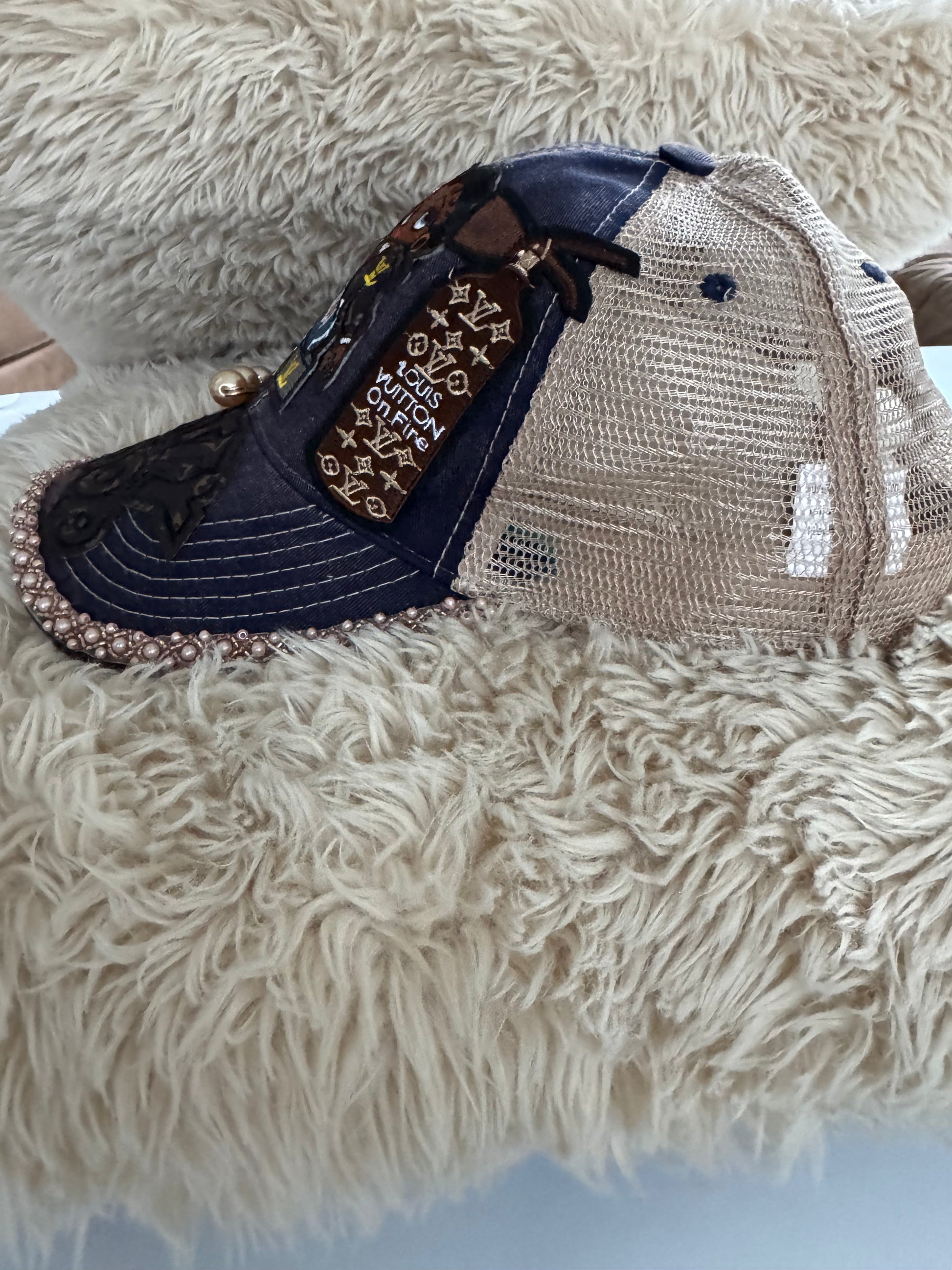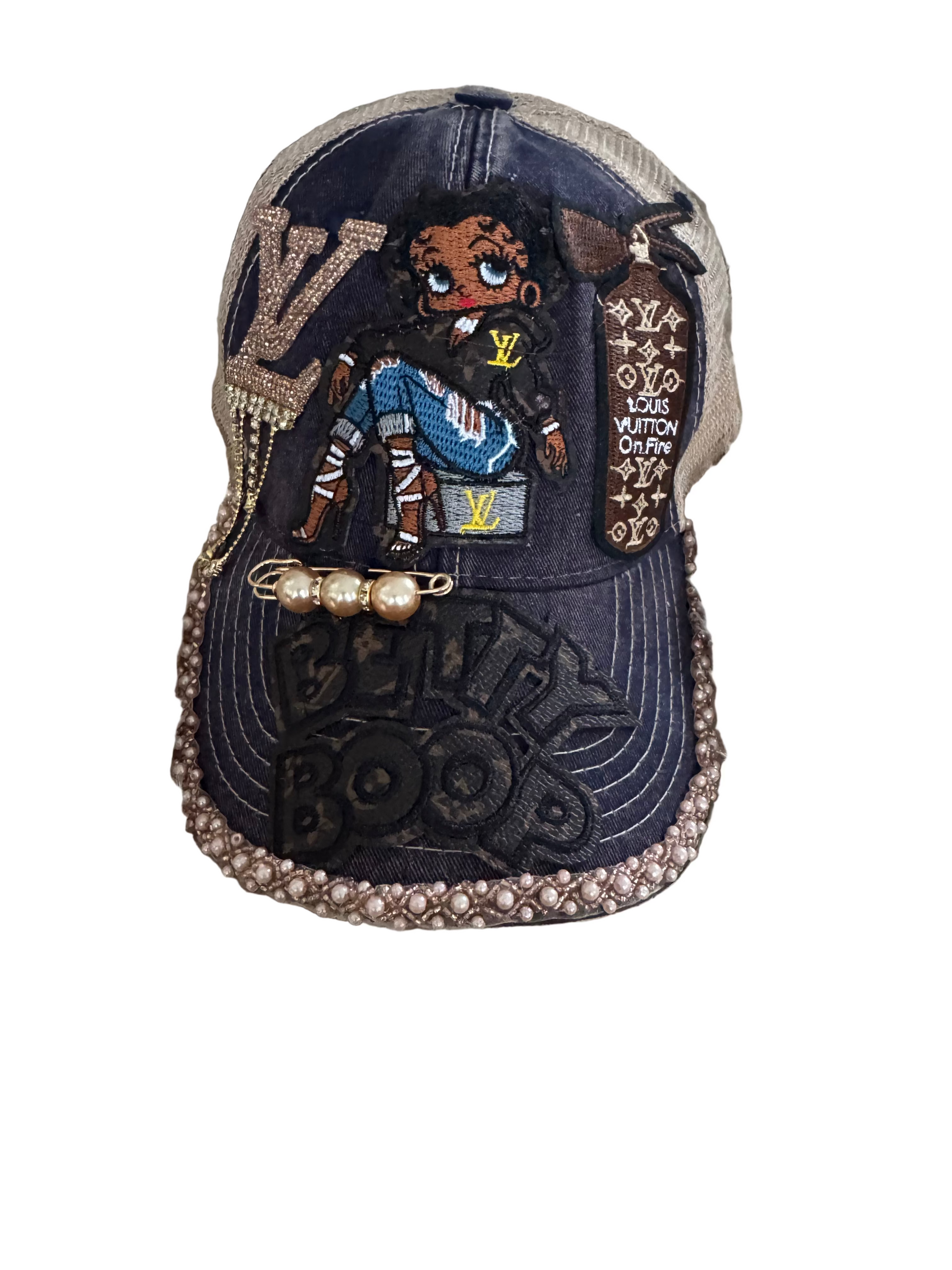 Stylish and cute Betty Boop Melanin Fashion Hat, a denim trucker cap that blends edgy attitude with everyday comfort. Sparkling crystal accents highlight the design, adding the perfect touch of glam. The adjustable back strap ensures a secure, personalized fit, making it an effortless accessory to elevate any casual look.