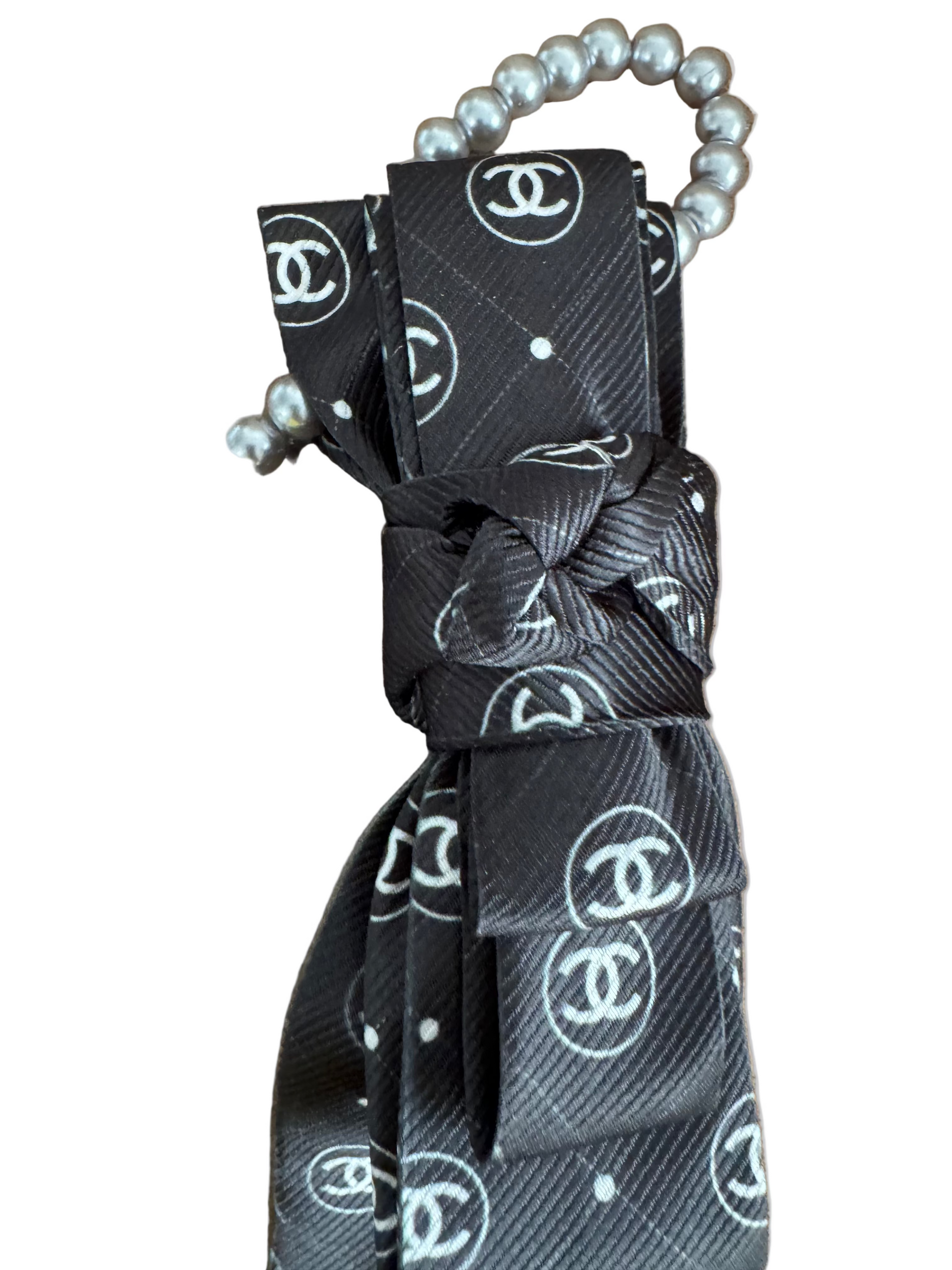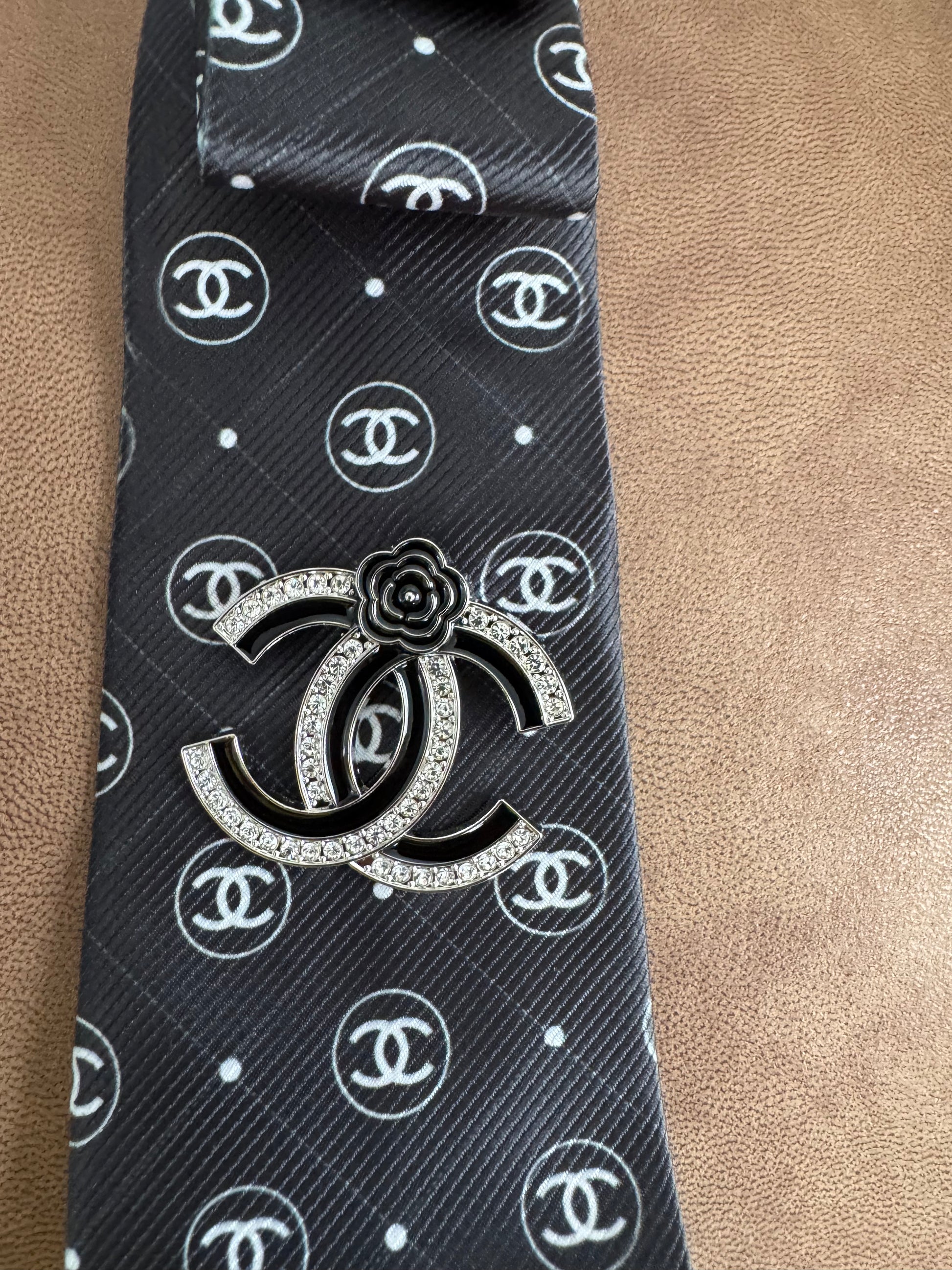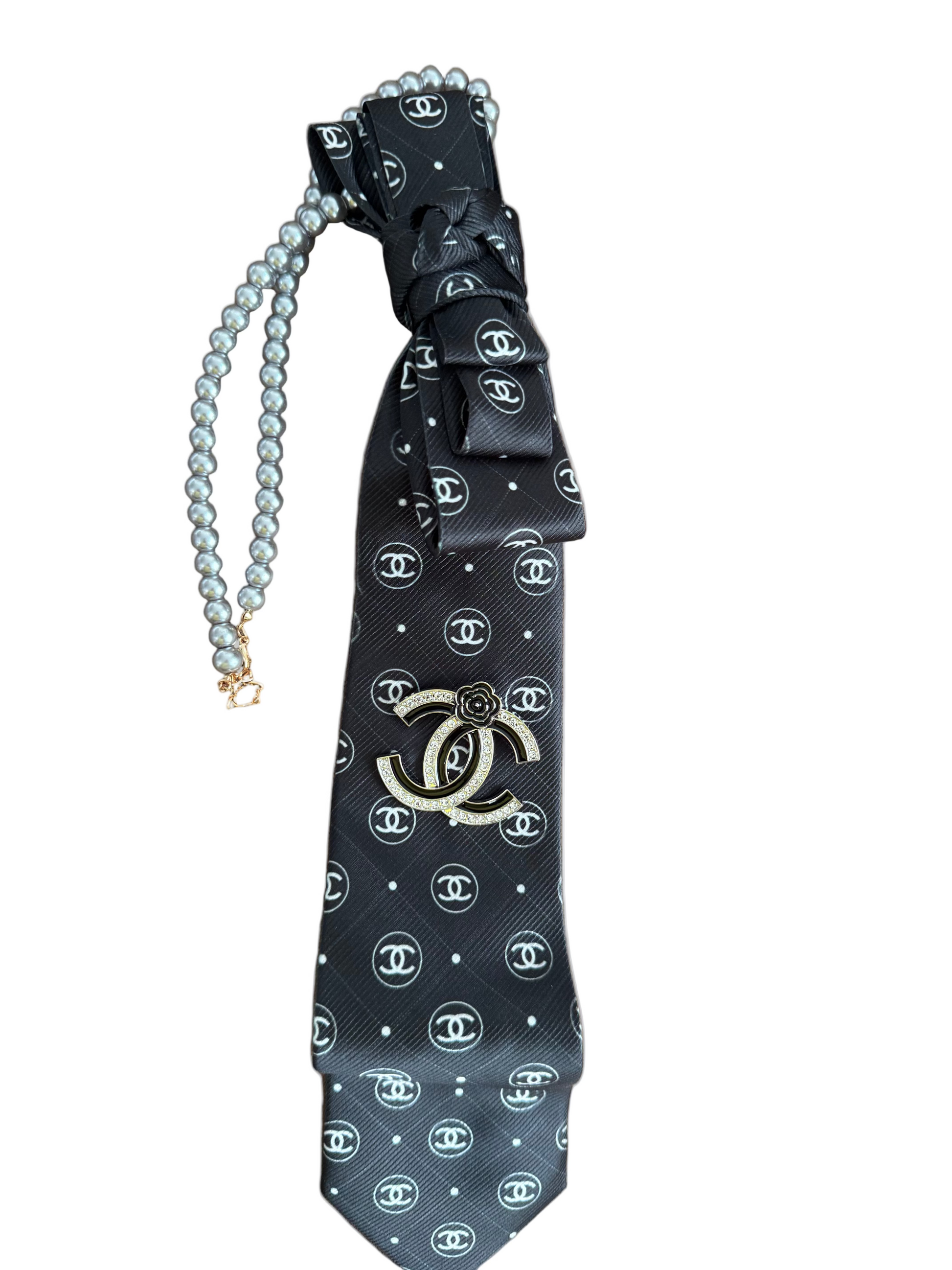Elevate your look with this beautiful black and silver tie, designed with a luxe CC-inspired touch. The standout feature is the removable CC-style brooch paired with a sleek silver pearl necktie, perfect for adding instant elegance to any outfit.