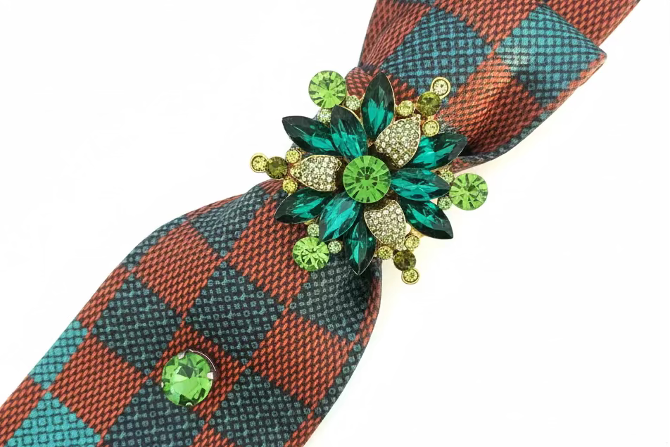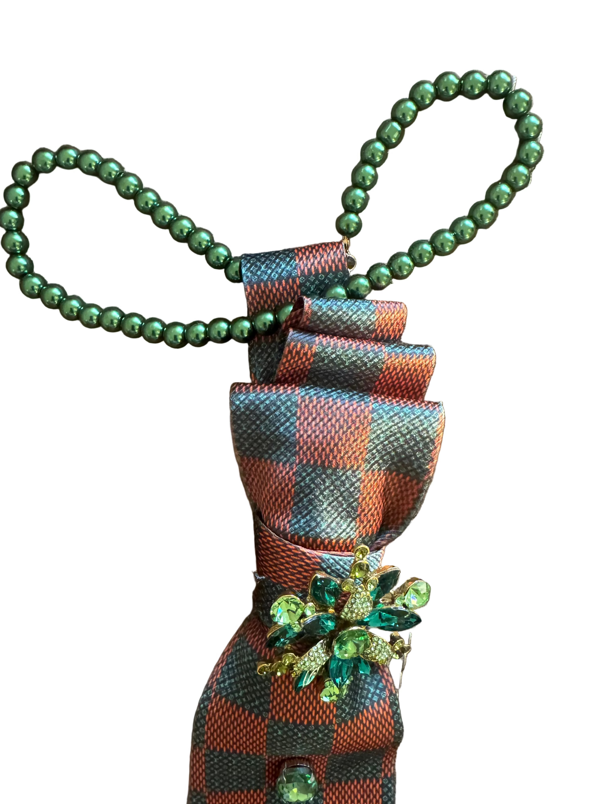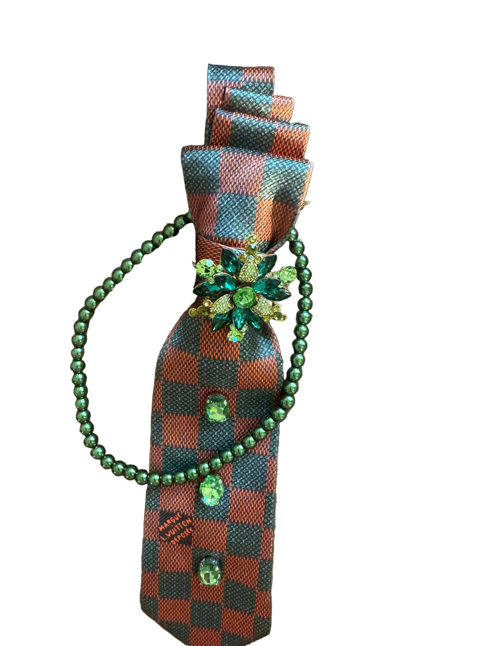 This Junktie is designed with rich orange and deep green tones and finished with sparkling emerald-inspired embellishments. This eye-catching piece blends classic pattern with luxe detail, making it perfect for holiday looks, special events, or standout fashion moments. The jeweled floral centerpiece and matching accents add a unique, glamorous touch that sets this tie apart.
