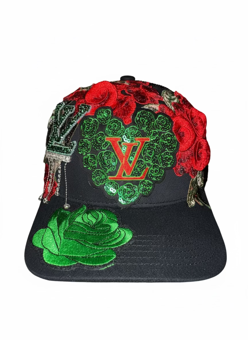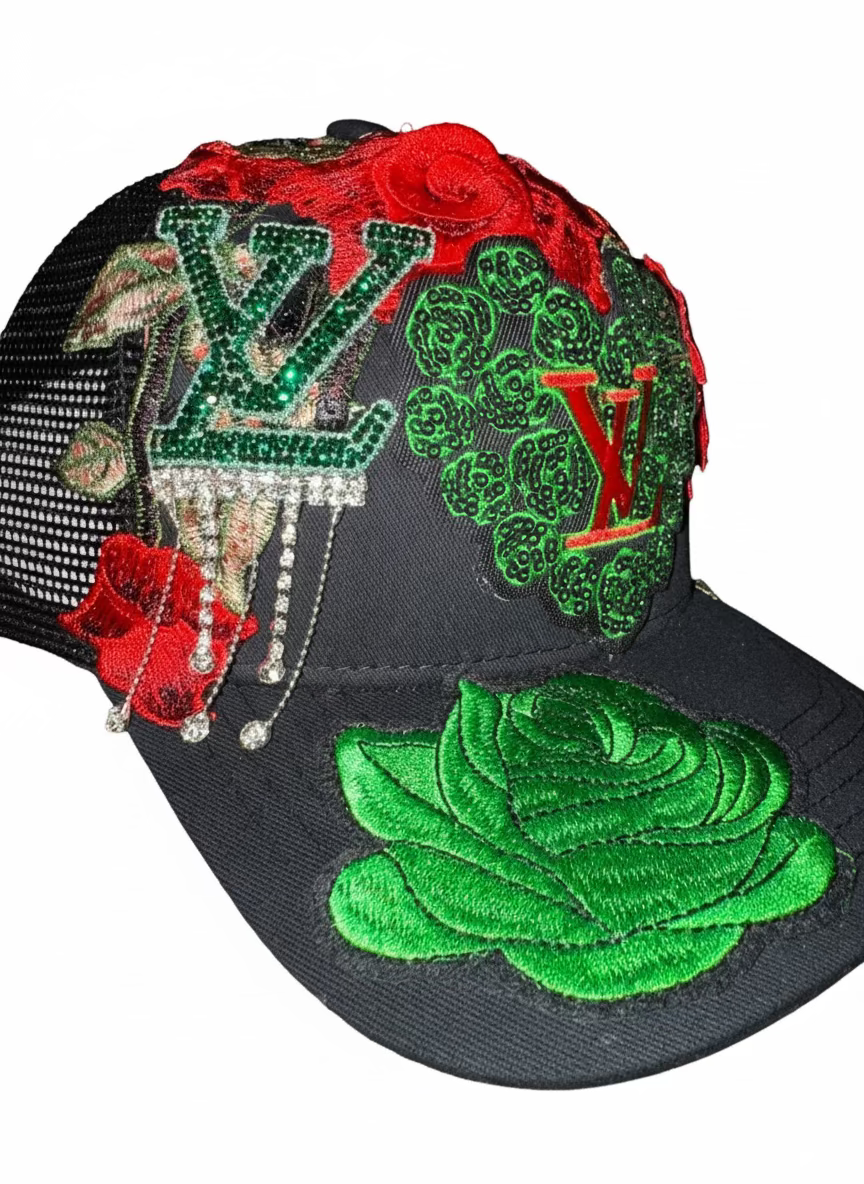 Beautiful and vibrant florals meet iconic LV-inspired patches in this statement trucker hat. Featuring bright, eye-catching flowers accented with bold red floral details, this design adds instant personality to any look.